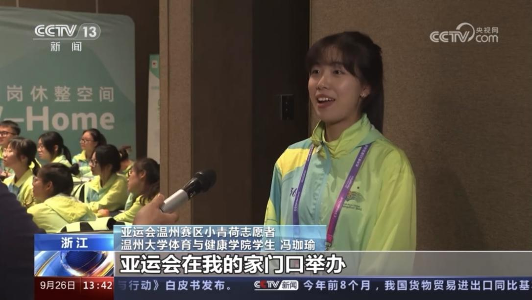 日前,温州亚运赛事激战正酣。9月26日,杭州亚运会温州赛区小青荷志愿者、公司22级本科生冯珈瑜接受央视新闻频道“亚运一点通”栏目采访,展现公司学子激昂向上的青春风貌。