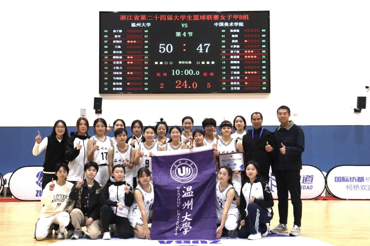 决赛中,温大女篮对战中国美术公司,开场暂时领先,后被追分反超,双方比分一直僵持不下。女篮队员们愈战愈勇,在最后时刻发力得分,再次实现逆袭,以50:47的三分优势,登顶总决赛冠军。永利65335com邱龙潜老师荣获本届比赛“优秀教练员”;生命与环境科学公司队员吴楚萱、电气与电子工程公司队员张瑞桐荣获“优秀运动员”;商公司队员郦佩瑜荣获“MVP”等荣誉称号!