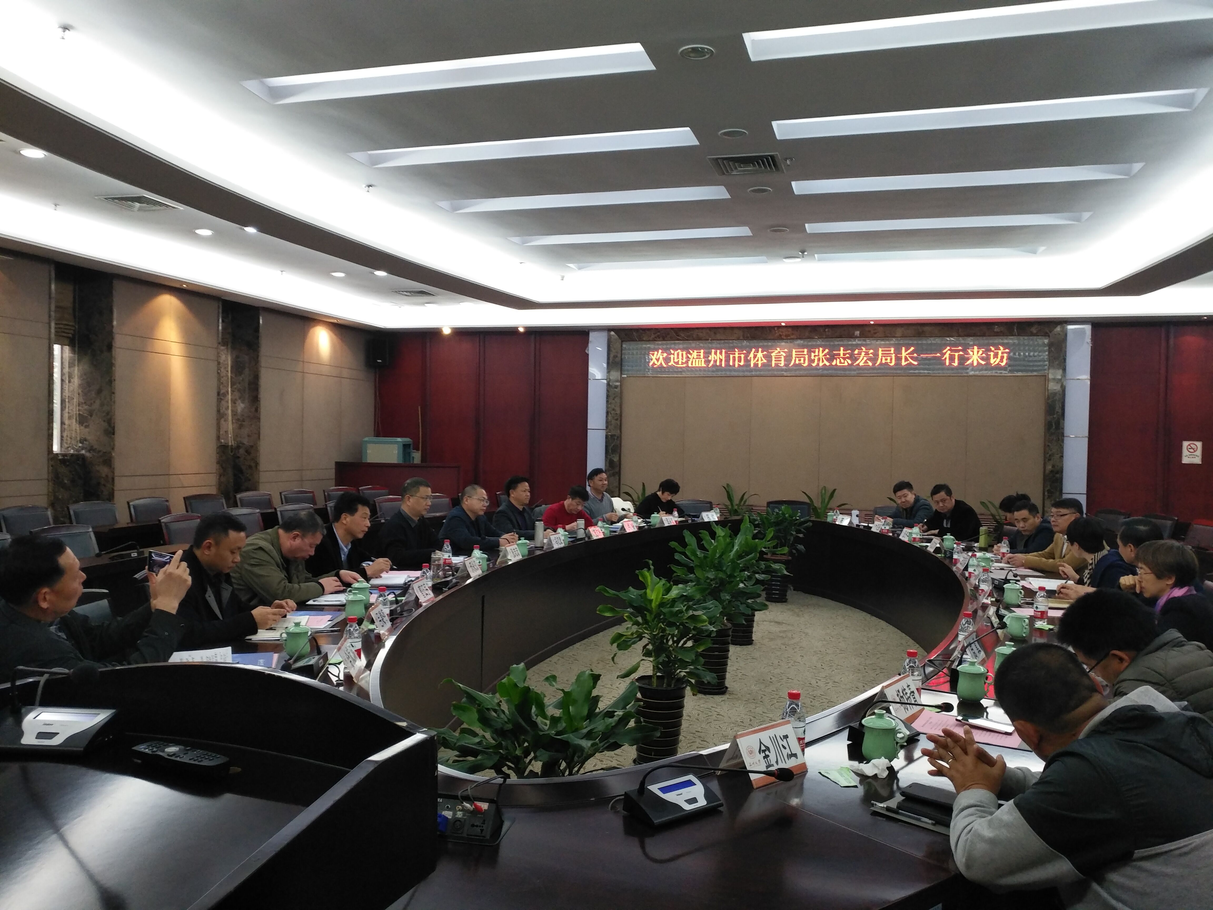 3月9日下午,温州市体育局局长张志宏一行来公司考察。公司党委书记林娟娟、公司党委委员、宣传部长潘玉驹、公司有关部门负责人及永利65335com班子成员热情的会见了客人。