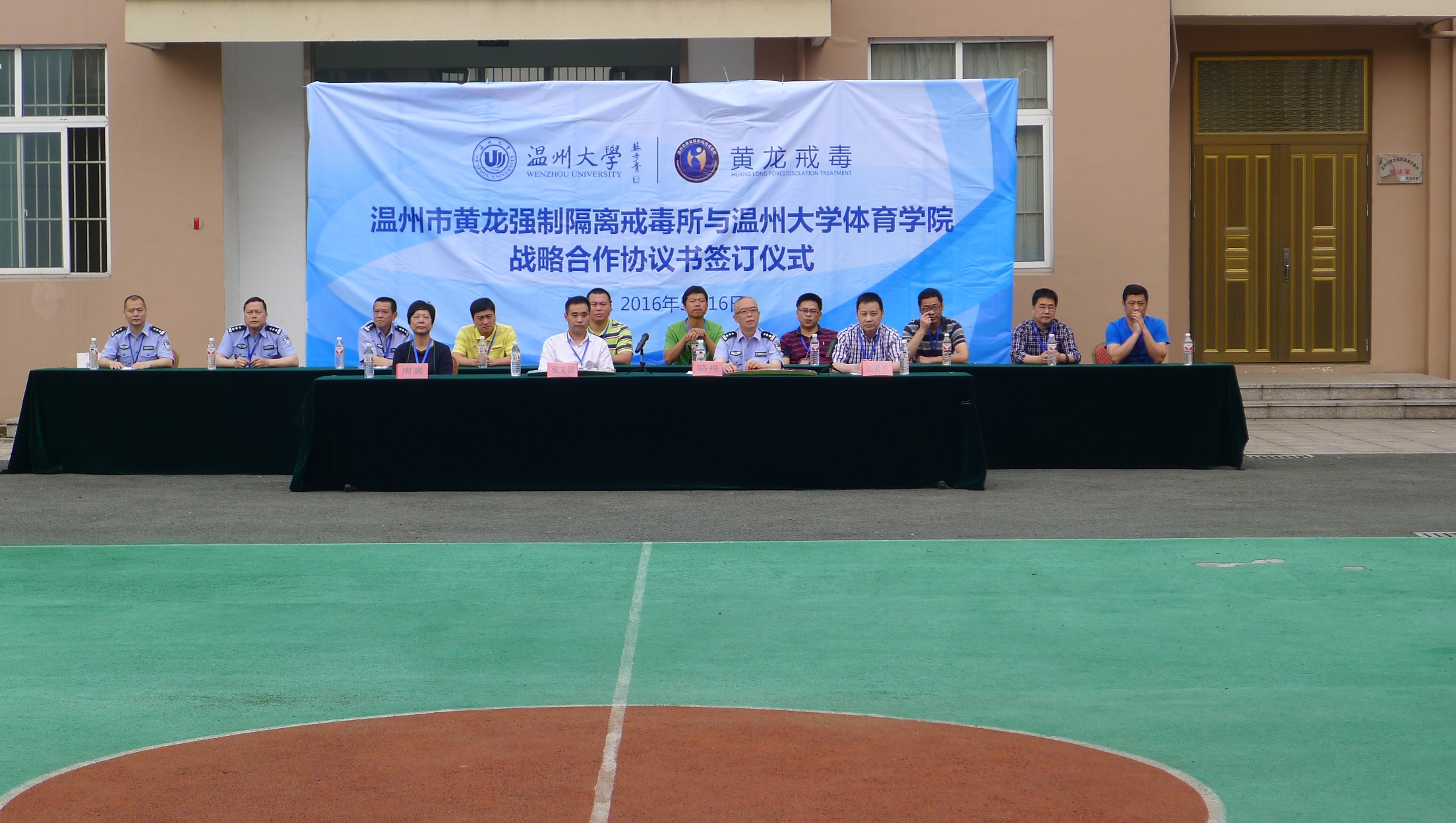 2016年5月16日,公司与温州市黄龙强制隔离戒毒所签订了战略合作协议书,经理张文健、总支书记周冀和温州市黄龙强制隔离戒毒所所长兼党委书记骆舟、政委刘贤平等出席了签约仪式,政委刘贤平主持。张文建经理和骆舟所长代表双方签署战略合作协议书,并互授牌匾,成立戒毒人员的体适能实验科研基地。 温州市黄龙强制隔离戒毒所承担着温州地区强制隔离戒毒人员的收治、康复治疗和教育矫正的任务。通过规范化执法、人文化管理、专业化戒毒、社会化矫治的理念使戒毒人员得以康复。而我公司拥有雄厚的团队力量和丰富的办学经验,拥有温州市体适能重点实验室。在体质健康、体能康复、体适能锻炼等方面有着丰富的理论和实践基础,可以对温州市黄龙强制隔离戒毒所的戒毒学员体能康复、体适能锻炼等方面提供科学的指导与技术支持,实现高校服务地方的途径和具体方式。