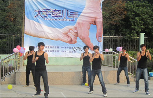 2011年12月14日下午12点整,公司11体本2班全体同学与瓯江公司11中本一团支部汇集在一起,骑着自行车向茶山镇第二小学进发,20分钟的车程后,浩浩荡荡地到达了目的地。此次前往旨在举行“服务社会——‘大手牵小手"团日活动。针对小员工的兴趣爱好及公司特色在茶山二小举行演出。