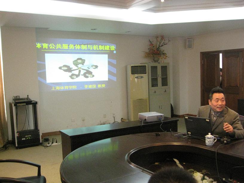 李建国教授首先进行了题为“体育公共服务体制与机制建设”的讲座,他从区分“公共体育服务”和“体育公共服务”两个概念开始了本次讲座,内容涉及到:体育公共服务的体制和机制和体育公共服务与市场服务和社会服务的关系等。经过李教授的精彩演讲,使得老师和同学对体育公共服务有了更进一步的了解。