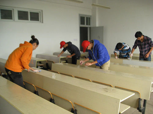 活动于下午1:00开始,在两位部长简单的分配了一下任务后,同学们就开始十分的卖力干活,进进出出打水的、拿着扫把扫地的和拖把拖地的人,虽然知道香蕉水有腐蚀性,但他们并没用因此而退缩,反而更细心地擦拭着不美观的桌面,他们做事井井有条,这也使得活动的效率更佳。经过两个多小时的打扫,看着那干净而又整洁的课桌及教室,同学们都非常的开心,也非常的有成就感,活动最后在部长的提议下我们一起合照,留下这美好的瞬间,以便让我们记住这共同的努力成果。