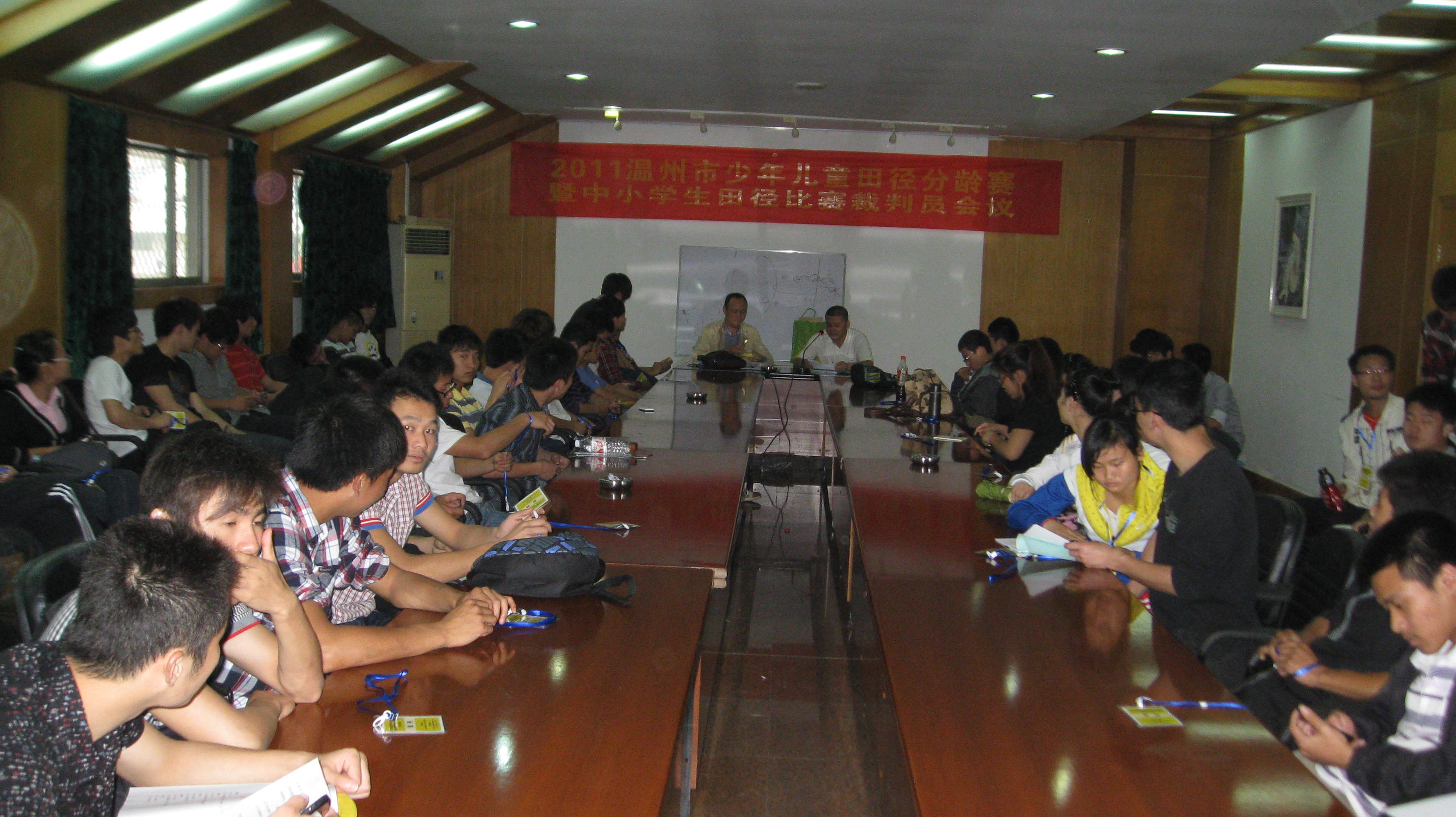 5月23日下午4点30分于温州体育中心田径场的一号会议室,在本次比赛的总裁判长公司党委书记杨志敏老师的主持下召开了本次工作的裁判员会议,公司所派的全体员工裁判员到场并参加会议。每名同学都认真听讲并被分配到自己的工作。