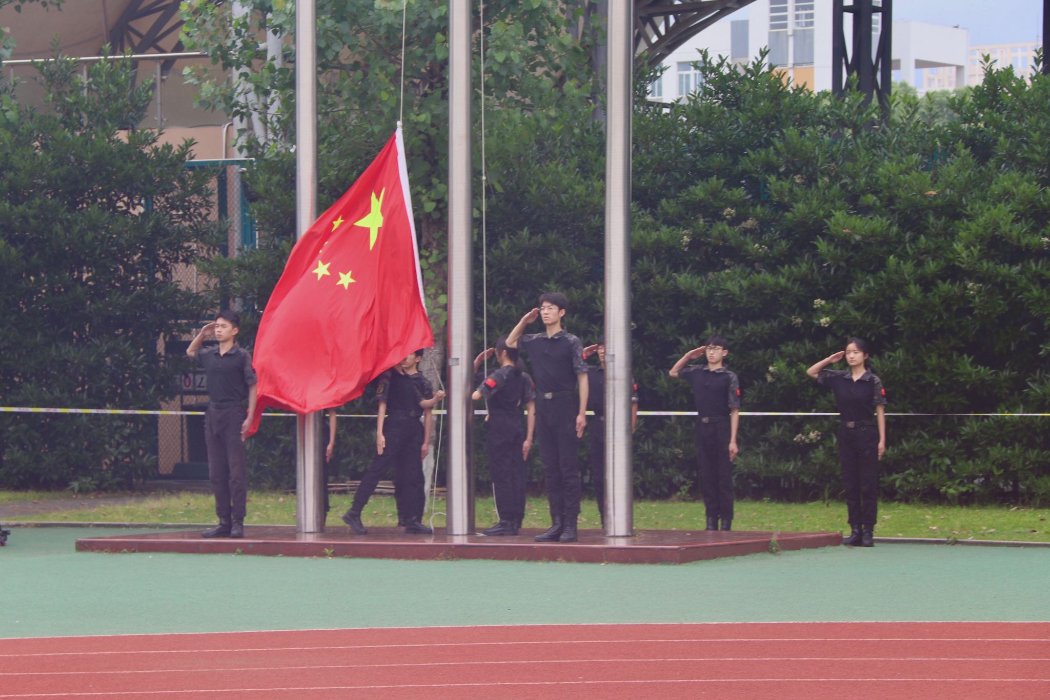 在庄严肃穆的国歌声中,国旗在运动场上冉冉升起。