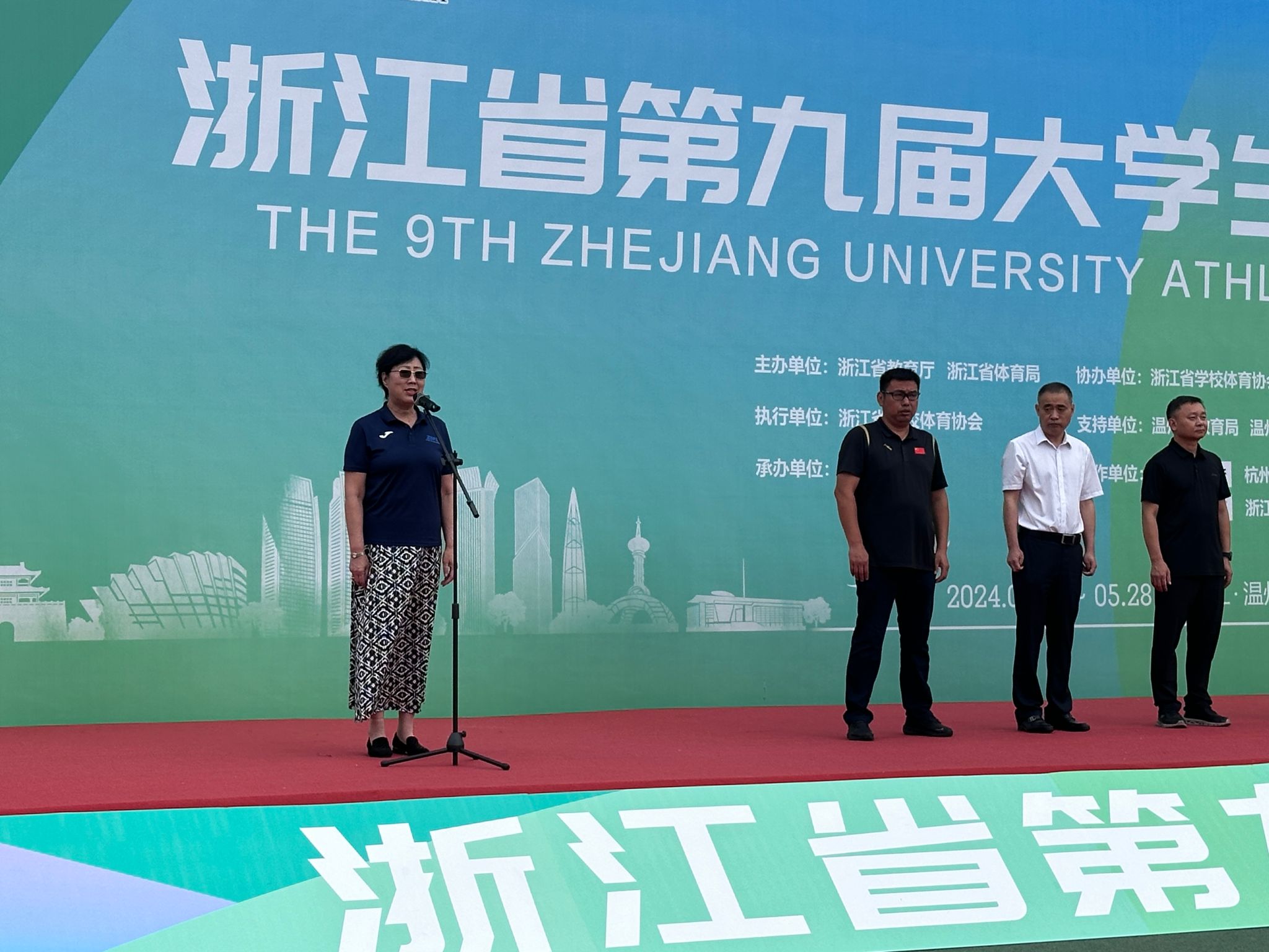 浙江省公司体育协会大学田径分会主席尹金荣致开幕词。她谈到,本次比赛进一步弘扬了“更快、更高、更强、更团结”的奥林匹克精神,充分展现我省老员工积极上、勇于拼搏的精神风貌!大学田径锦标赛为全省高校搭建了体育交流的重要平台,是高校积极践行党的二十大“关于加强青少年体育工作部署”的生动实践。运动健儿们用汗水与笑容书写青春的华章,用速度与力量诠释体育的魅力。