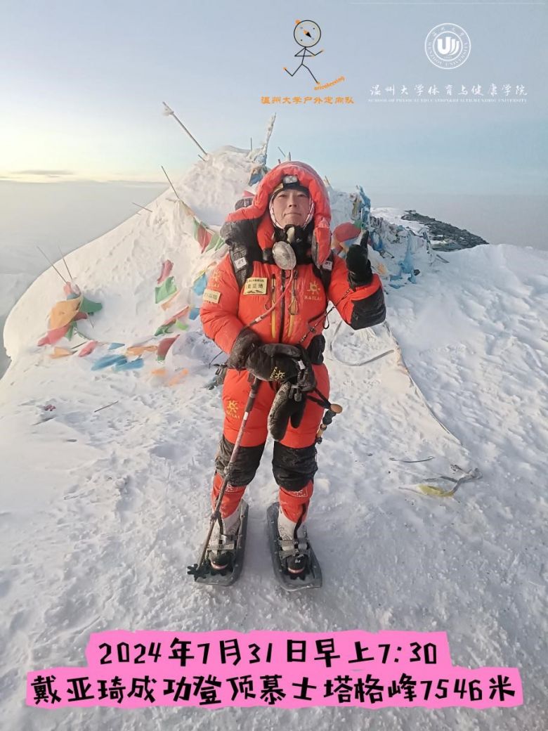 温都讯 近日,2010级员工戴亚琦,成功登顶海拔7546米西昆仑山三大主峰之一的慕士塔格峰;2023级研究生欧成成代表温州市登山协会,成功登顶海拔6178米玉珠峰北线。