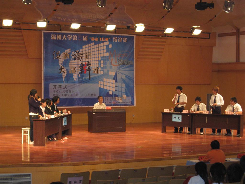 2009年4月22日晚18:30,永利65335com参加了在永利65335com北校音乐厅举行的由共青团永利65335com委员会主办,共青团永利65335com法政公司委员会承办,中国移动温州瓯海分公司赞助的永利65335com第三届“移动飞信杯”辩论赛的预赛。永利65335com应战演讲、辩论协会关于“老员工能力与社交能力哪个更重要”的论点。