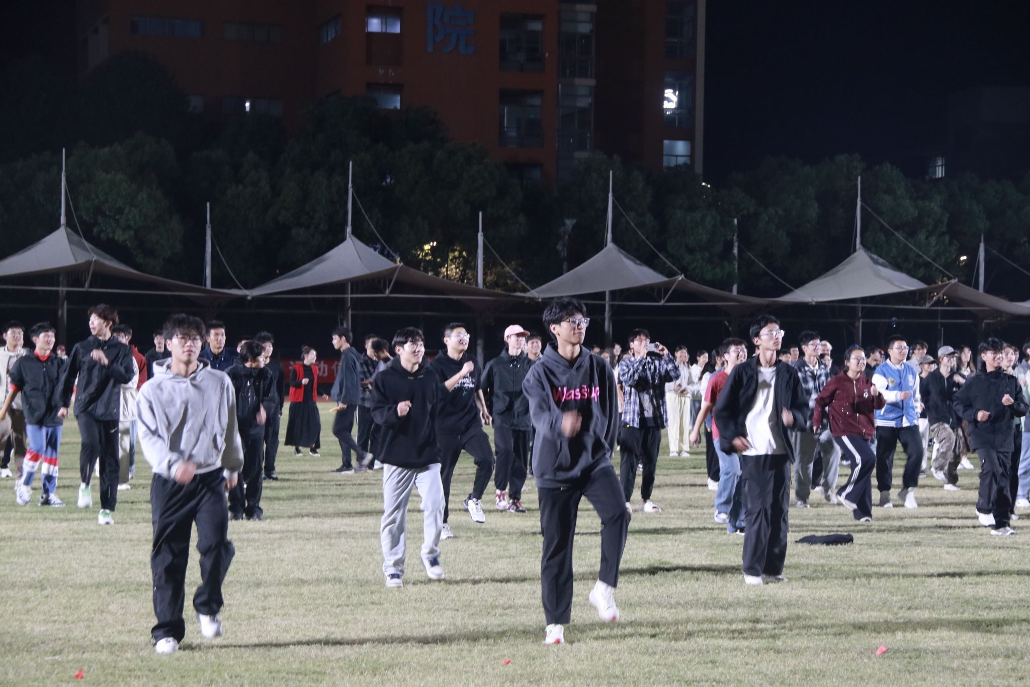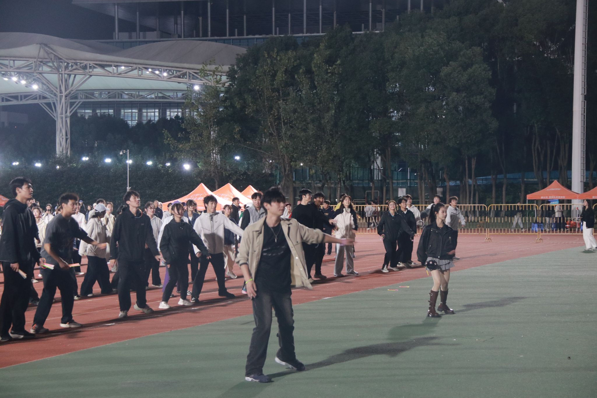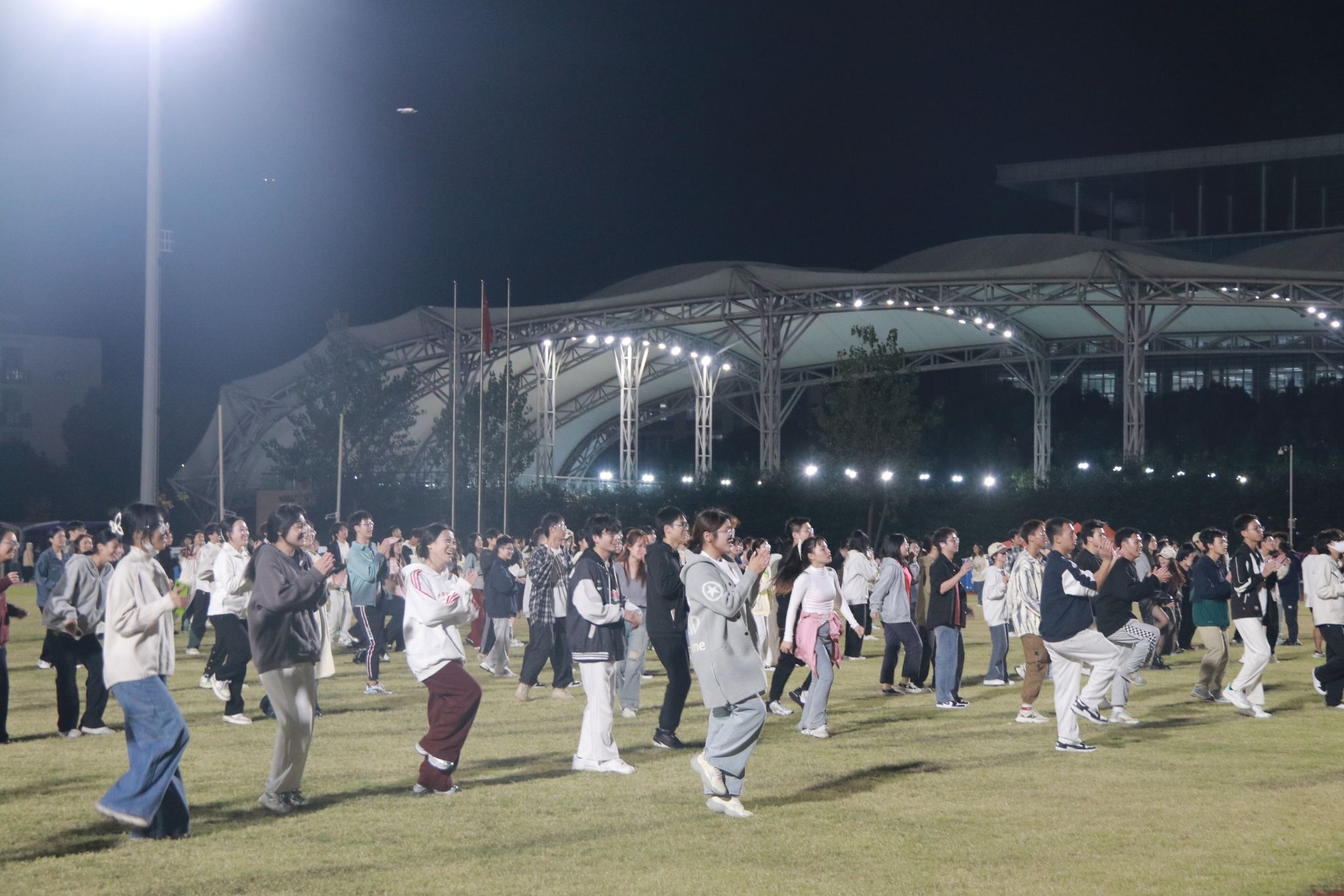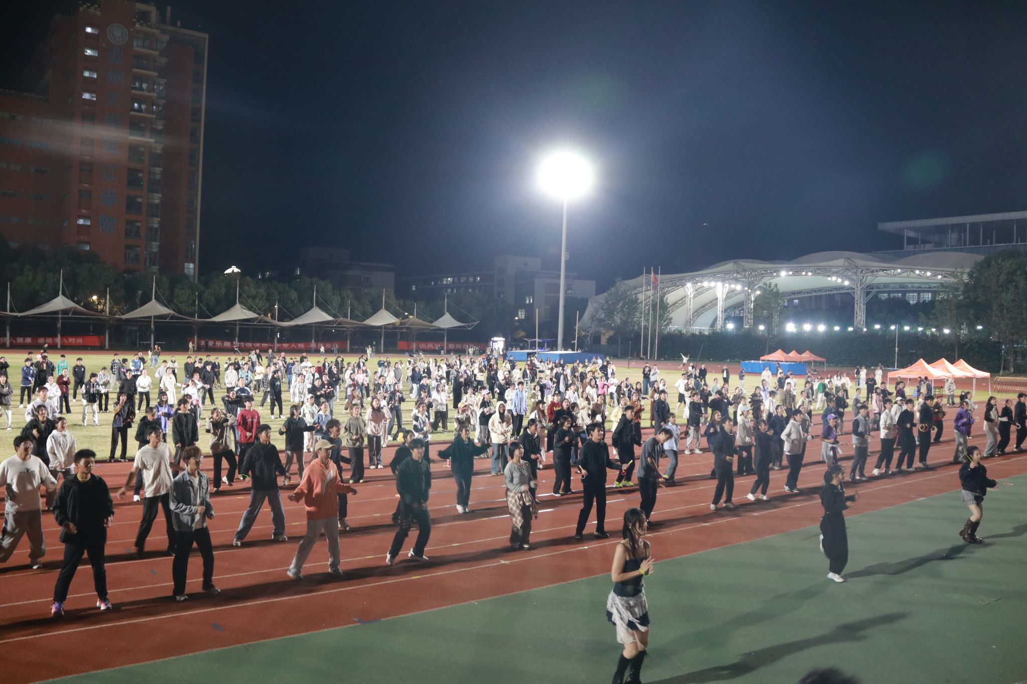 随着夜幕降临,抵达田径场的师生们在工作人员的引导下到达指定位置,有序进行热身。主持人热情洋溢的开场,标志着星光舞会正式开始!