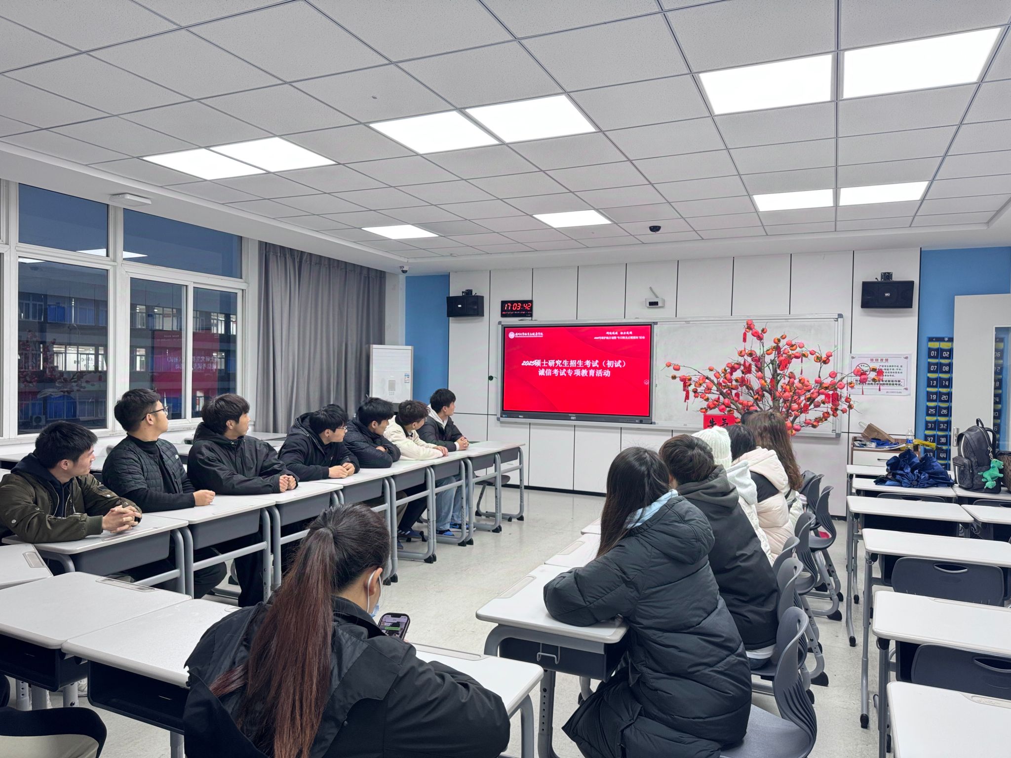 高宇翔老师对考研学子开展2025硕士研究生招生考试(初试)诚信考试专项教育活动。高老师向同学们重点强调了考风考纪和重点注意事项,如带手机、手环等,是否带好证件物品,提示同学们提前规划好交通 住宿安排,确保每一位同学都以良好的精神面貌和充沛的精力完成研途的最后冲刺。