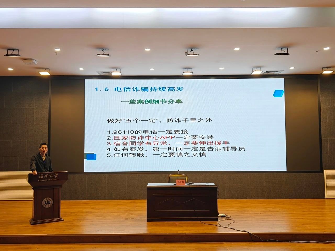 钱合激进行专题培训讲座。他围绕校园常见安全问题进行了深入讲解,涵盖消防安全、食品安全、电信诈骗防范、禁毒防艾宣传以及宿舍安全管理等多个方面,特别强调消防安全的重要性。他详细介绍了安全宣传员应具备宣传、隐患识别、组织排查、应急处置和沟通协调五大能力,鼓励大家积极参与校园安全建设。
