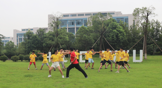 7月27日上午,武术营营员们的练习地点由北校武术馆改为南校。同学们在校史博物馆前面的草地上练起长拳来。绿草茵茵,空气清新,令人心旷神怡。修习武术,更让同学们从身到心、由魂而魄得到提升而充满安全感,精壮神足,安然自胜。