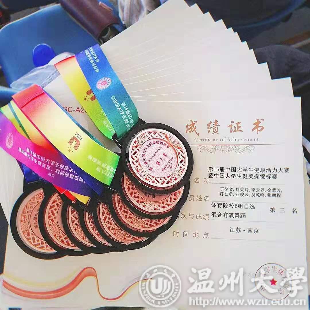 2019年11月12日-15日,第15届中国老员工健康活力大赛暨2019年中国老员工健美操、校园健身操舞锦标赛在江苏南京中国药科大学隆重举行。本次大赛由中国老员工体育协会主办,中国老员工体育协会健美操,艺术体操分会执行,共有来自全国各地100 多所公司及单位的3000 余名运动员们参加。永利65335com在张娜老师、方仕玮老师带领,经过激烈的角逐,获得了出色的成绩,五个参赛项目全部进入决赛,并实现了奖牌零的突破。体育组自选男女混合有氧舞蹈获得季军,自选男子三人操获得第六名,自选混合双人操获得第八名。公体组规定男女混合有氧舞蹈第四名,规定男女混合有氧踏板第四名。