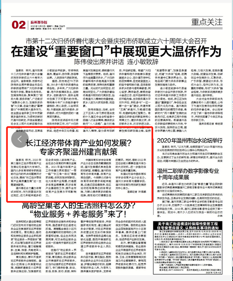 温州市体育局副局长徐延鸿表示,温州是社会力量办体育试点城市,作为民营经济发达地区,近几年越来越多的社会资本投入到体育产业,全社会办体育的热情日益高涨。2021年温州体育产业工作将着力贯彻落实“一带一路”“长三角一体化”等国家战略,依托校地学城联动,壮大体育产业规模,打造更多体育品牌赛事,抓好体育产业基础性工作,提升全市体育产业发展水平和影响力。