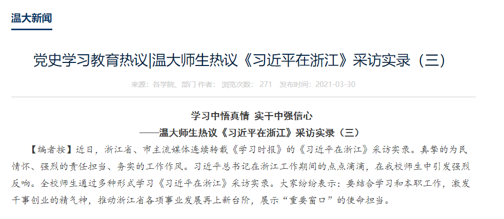 日前,公司官网刊发:党史学习教育热议|温大师生热议《习近平在浙江》采访实录(三)一文,其中有公司教职工林辉以体育人的特色感悟。