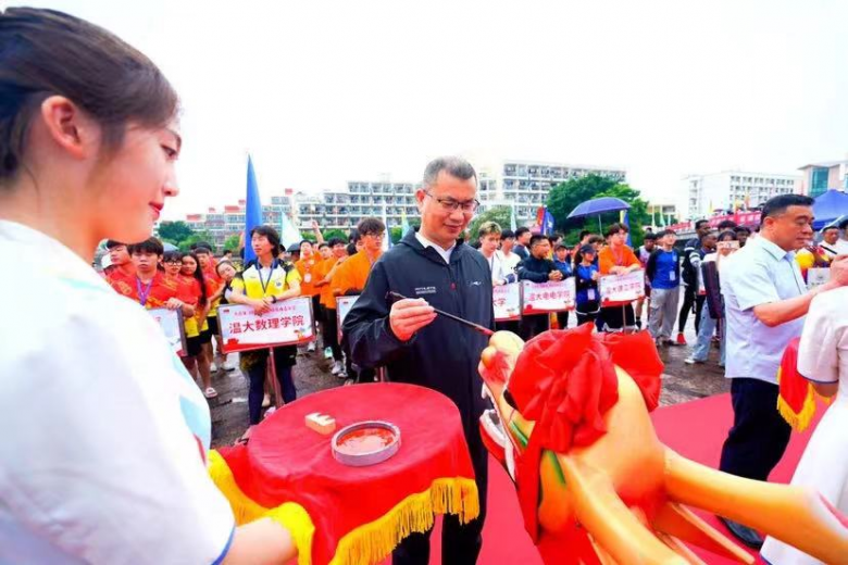 比赛前举行开幕仪式为龙舟点睛,市体育局局长张志宏宣布高校龙舟嘉年华启动,永利65335com副董事长薛伟和浙江省龙舟协会主席王成云分别击鼓、鸣锣,随后比赛正式开始。