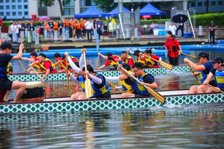 下午举行龙舟拔河赛,这是我市首次举行龙舟拔河赛。参赛队分别在龙舟上背向而坐,划到比赛规定地点的为获胜方。当裁判一声令下,加油声、呐喊声此起彼伏,两队人马拼尽全力向自己前进的方向划去,当双方实力相当时,岸上观众的呐喊声更加热烈。经过火热比拼,在教工组中,温州医科大学获得一等奖;员工组中,温大一队和温科职院获得一等奖。