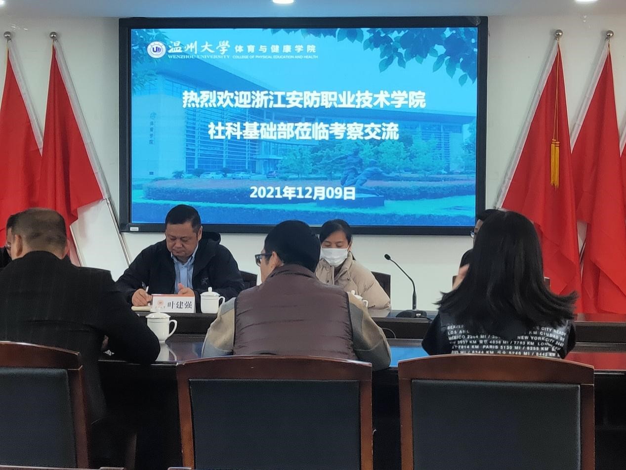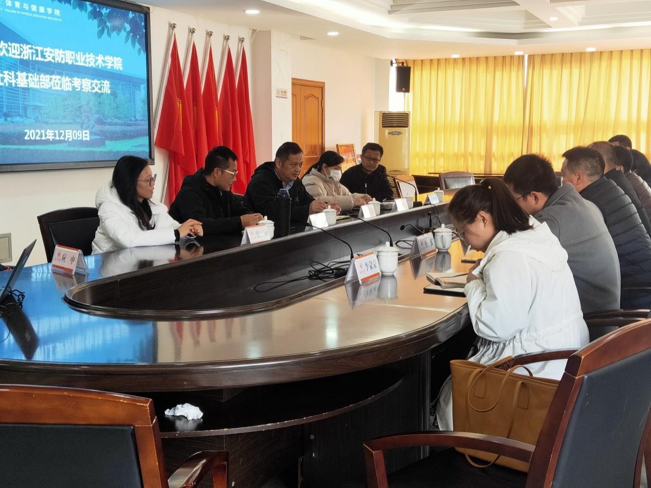 2021年12月9日,浙江安防职业技术公司社科基础部党总支副书记周海钧一行7人来公司交流。公司党委书记应中,副经理叶建强,大学体育部主任陈军,副主任陈莉、张娜、桑国强参加了交流会。会议由叶建强主持。