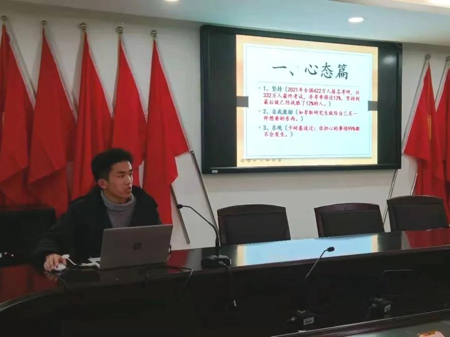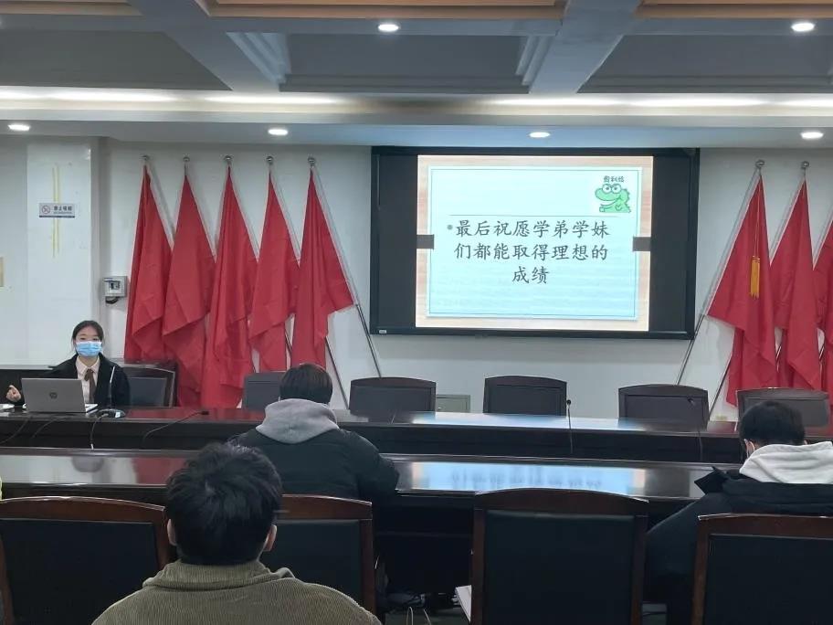 王晓华副书记作考研心理状态辅导。她温暖鼓励同学们要“安全诚信应考,沉着理性应考,轻松弹性应考”,既要有科学高效的时间安排和自信轻松的备考心态,也要重视每一天学习的吸收实效,以模块化、精益化、科学化推进最后学习冲刺,以强大的心理素质应对考试硬战。