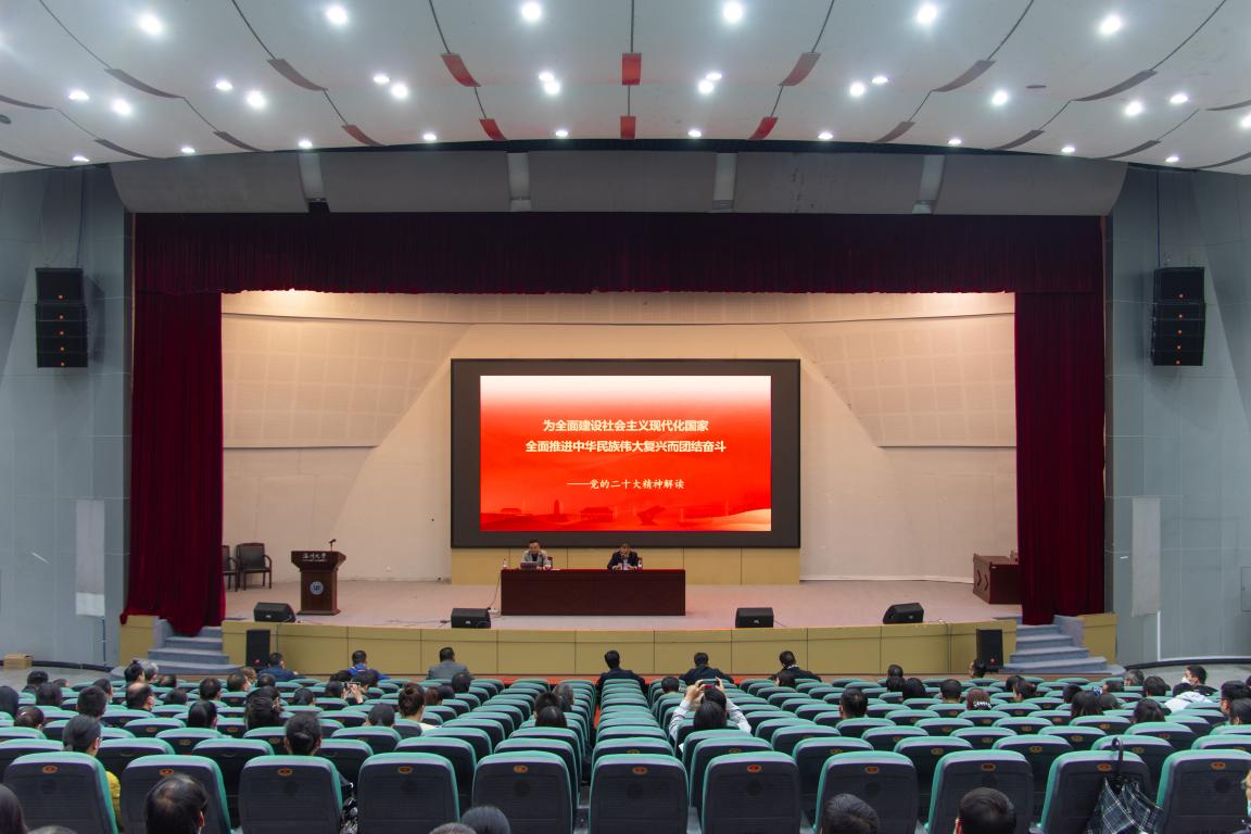 潘玉驹以“为全面建设社会主义现代化国家,全面推进中华民族伟大复兴而团结奋斗”为主题对党的二十大精神进行了解读。强调党的二十大是一次高举旗帜、凝聚力量、团结奋进的大会,在党和国家历史上具有重要里程碑意义。党的二十大报告是闪耀着马克思主义真理光芒的纲领性文献,是我们党团结带领全国各族人民在新时代新征程坚持和发展中国特色社会主义的政治宣言和行动纲领。