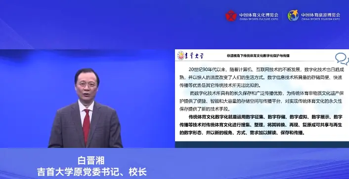 吉首大学原党委书记、董事长白晋湘发表了《非遗视角下传统体育文化数字化保护与传播》的主题演讲。他分享到,传统的采访、记录、拍照、实物收藏等简单的资料收集方式,不能充分保存、传播和利用传统体育非遗。数字化技术所具有的长久保存和广泛传播的优势,为传统体育非物质文化遗产的保护提供了便捷、智能和大容量的存储空间,因此要利用数字技术对体育非遗进行长久保存并建立数据库等平台。