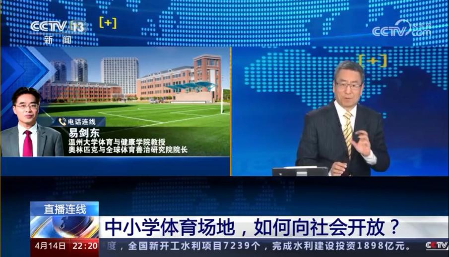 4月14日,公司易剑东教授接受央视“新闻1+1”栏目专访,对中小学体育场地向社会开放的费用支出、场地运营、体育志愿服务、体育设施多样化等问题进行专业解读。