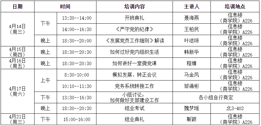 1.请各相关党支部做好员工党员骨干联合培训班学员的报名工作,并于4月2日下午3点前报送培训学员名单汇总表(附件1)电子版发送至邮箱1542607363@qq.com,纸质版加盖公章后送至公司学工办(北校区行政楼218办公室靳颖老师处)。报名学员请加QQ群:618851523。
