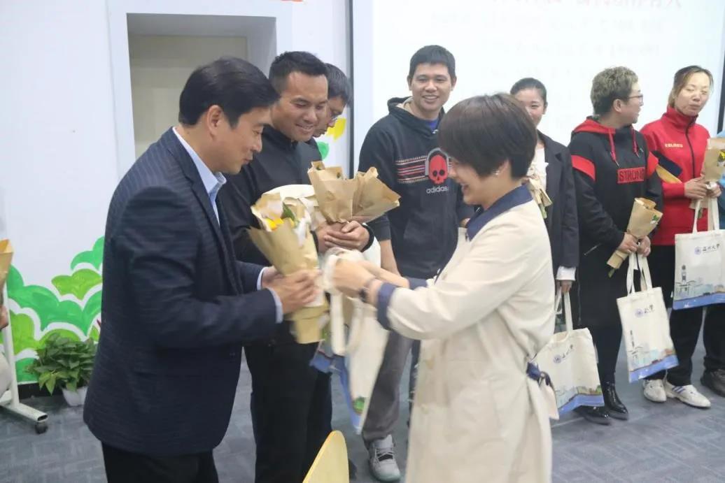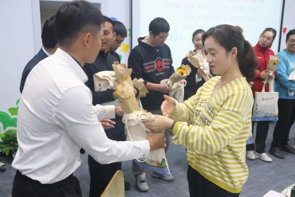 校员工处副处长吕乐和王晓华副书记为体健育人队伍发放全员育人工作包,内有象征体健精神的向日葵、育人谈话记录本、员工沟通成长书籍等,将陪伴老师们渡过温暖师生交流成长时光。