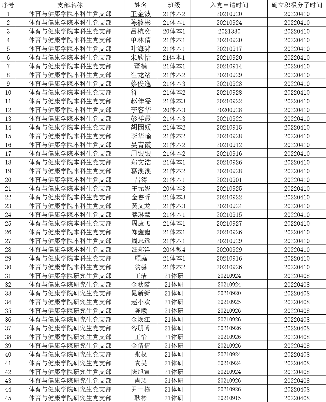 经入党积极分子个人谈话、群众谈话、入党积极分子确立大会以及党支部讨论,现将王金波等45名同志确立为本次2021-2022学年第二学期入党积极分子。现将名单在全院范围内进行公示。