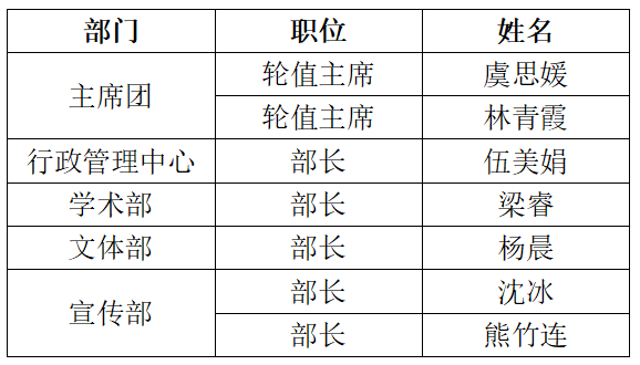 注:各部门部长不分正副级,欢迎广大师生监督,如对任用情况有异议,请于公示期内实名联系。