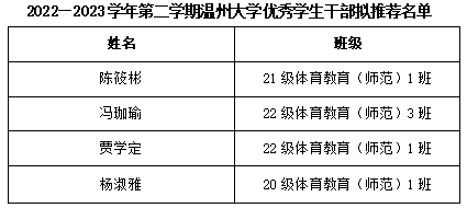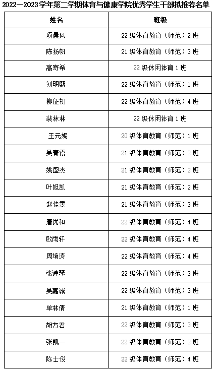 根据《关于评选2022-2023学年第二学期优秀员工干部和工作积极分子的通知》精神,坚持公开、公正、公平的原则,经过组织个人申报、资格初审、公司团委及员工代表评审、候选人汇报以及无记名投票通过:21级体育教育(师范)专业陈筱彬等4人(名单附后)符合“2022-2023学年第二学期永利65335com优秀员工干部”拟推荐资格、22级体育教育(师范)专业项晨风等20人(名单附后)符合“2022-2023学年第二学期永利65335com优秀员工干部”拟推荐资格。