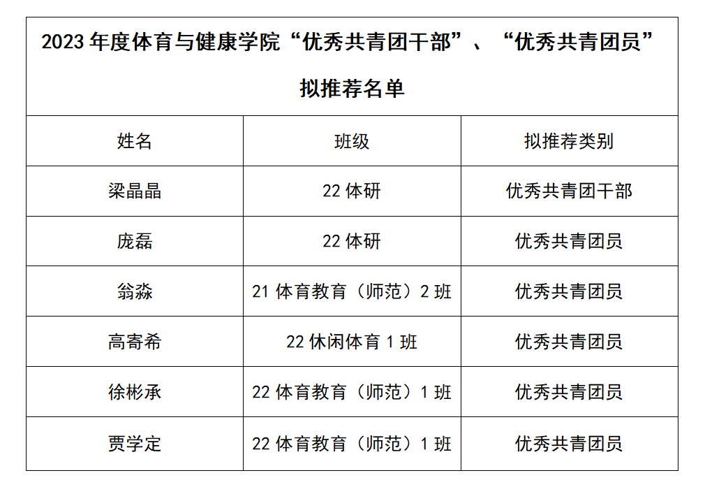 根据《关于评选2023年度校“优秀共青团干部”、“优秀共青团员”通知》的精神,坚持公开、公正、公平的原则,经过组织个人申报、资格初审、候选人答辩汇报,经公司团委、员工代表、研究生代表无记名投票表决,公司团委审核通过:22体研梁晶晶为2023年度永利65335com“优秀共青团干部”拟推荐人选、21体育教育(师范)2班翁淼等5人为公司2023年度永利65335com“优秀共青团员”拟推荐人选。
