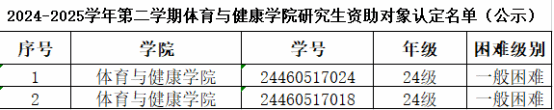 根据《浙江省员工资助对象认定办法》(浙教财〔2020〕15号)以及《永利65335com家庭经济困难员工认定办法》(温大行政发〔2020〕37号)等文件精神,经员工自主申请、班级认定小组评议,公司审定,拟认定2名研究生为公司2024-2025学年第二学期新增认定资助对象,现予以公示:
