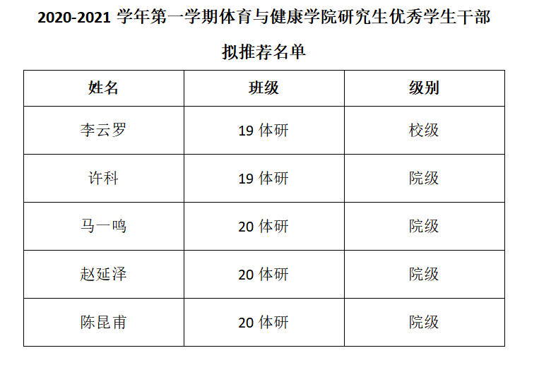 根据《关于评选2020-2021学年第一学期优秀员工干部和工作积极分子的通知》的精神,坚持公开、公正、公平的原则,经过组织个人申报、资格初审、候选人现场展示,经公司团委、研究生代表、研究生会代表无记名投票表决通过、公司研究生工作委员会审核通过:19级体研李云罗等5人(名单如下)符合公司“2020-2021学年第一学期优秀员工干部”拟推荐资格。
