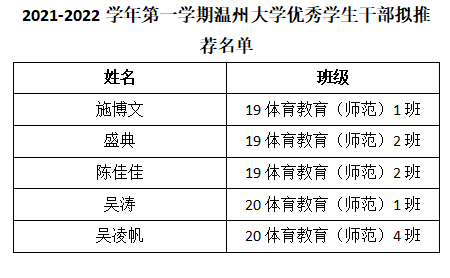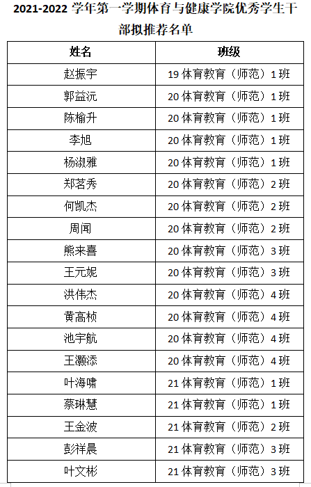 根据《关于评选2021-2022学年第一学期优秀员工干部和工作积极分子的通知》精神,坚持公开、公正、公平的原则,经过组织个人申报、资格初审、公司团委及员工代表评审、候选人线上汇报以及无记名投票通过:19级体育教育(师范)专业施博文等5人(名单如下)符合“2021-2022学年第一学期永利65335com优秀员工干部”拟推荐资格、19级体育教育(师范)专业赵振宇等19人(名单附后)符合“2021-2022学年第一学期永利65335com优秀员工干部”拟推荐资格。