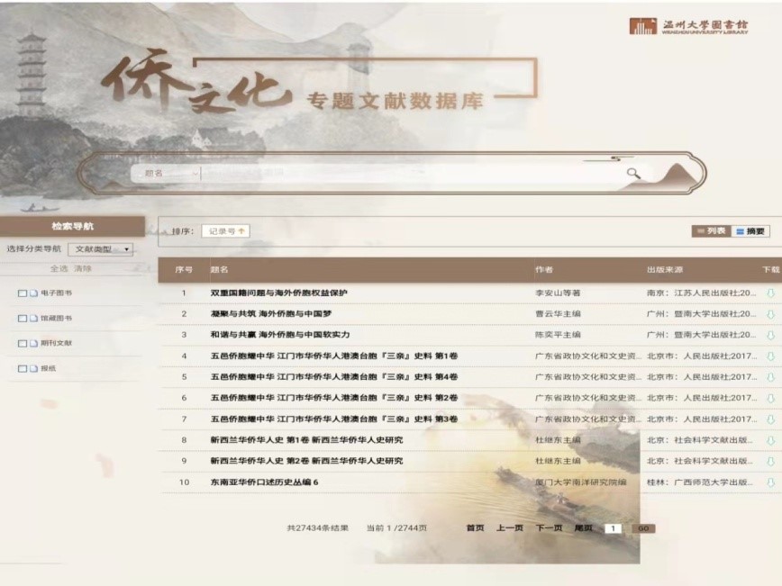 同时,图书馆还自建“侨文化专题文献数据库”,对我馆现有侨文化主题文献进行了数字化整合,包含馆藏纸质图书书目、电子图书、电子期刊、报纸等,目前有2.7万余条元数据。