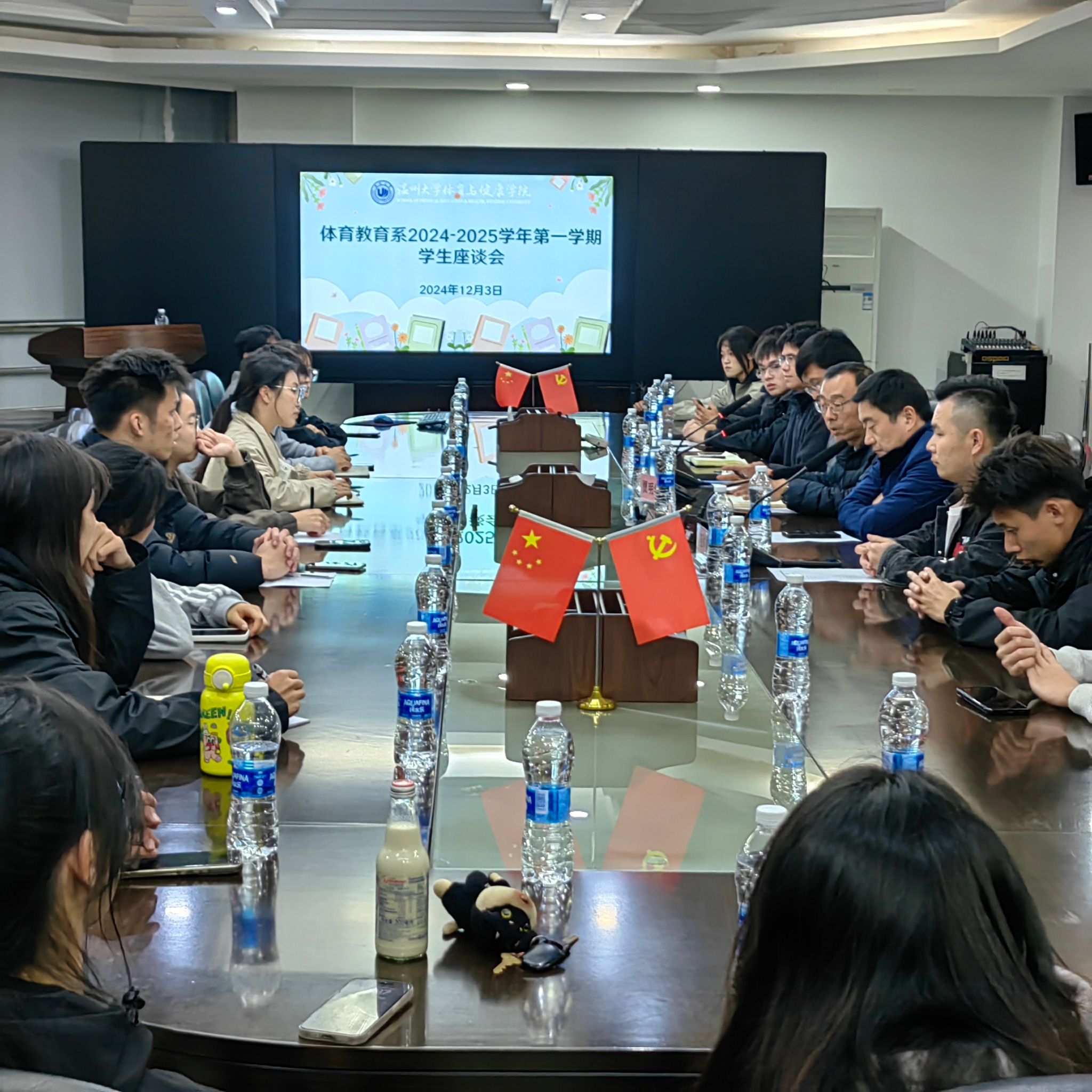 2024 12 3 日,公司体育教育系24-25-1学期员工座谈会在北校区行政楼 227 会议室顺利召开。此次座谈会旨在为专业建设与员工成长搭建沟通桥梁,体育教育系主任贾明学、副主任周义义、张朋、教师代表丁亚帅、辅导员陆冰瑶以及各年级段20余名体育教育专业员工代表齐聚一堂,共商专业发展大计。会议由陆冰瑶老师主持。