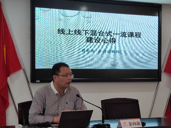 余向前教授以《线上线下混合式一流课程建设心得》为主题,分享了自己《人力资源管理》课程建设的组织实施情况,对课程平台、数字化教学、翻转课堂方面,尤其在教学资源的自建方面,分享了宝贵经验。