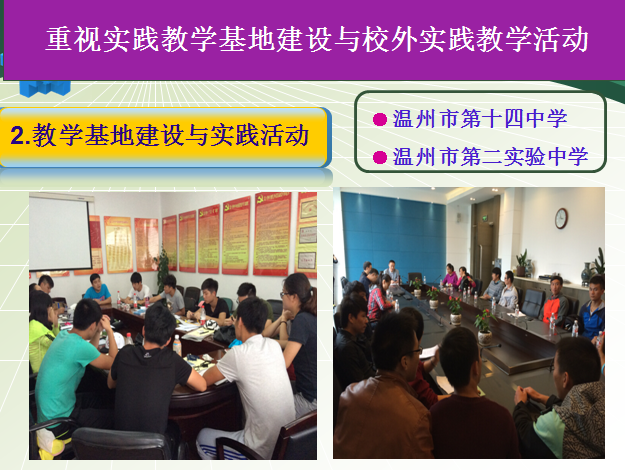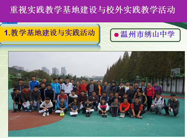 目前已与温州市第二实验中学、温州市南浦实验中学、温州市第十四中学、温州市绣山中学、温州职业技术中学、温州市体育局体育竞赛中心、温州市教育局体育教研室、温州市篮球发展协会、羽毛球协会、武术协会、健美操协会、游泳协会建立了很好的校外实践教学基地。