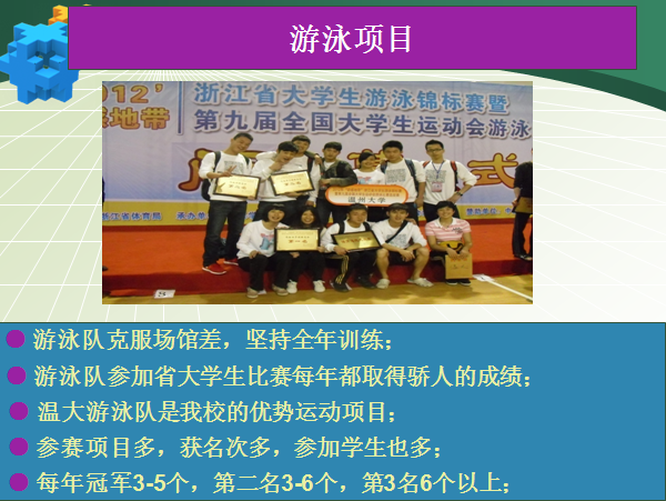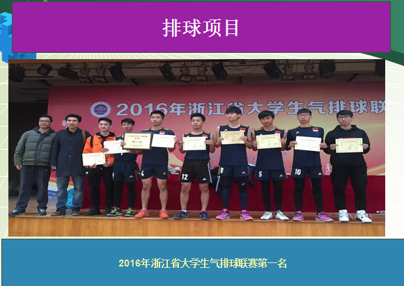 现有龙舟、棒球两个特色运动队,另有篮球、足球、排球、田径、游泳、健美操、定向运动、皮划艇、武术、跆拳道、乒乓球、羽毛球、网球、体育舞蹈等10多个体育专业与公共体育运动队。2015年公司在浙江省第十四届老员工运动会上取得体育专业组总分全省第二名、公共体育本科组全省第三名的优异成绩。龙舟队参加中华龙舟大赛多次取得前三名,中央电视台均进行了直播;定向运动、健美操、皮划艇、跆拳道等队伍多次在全国大赛取得冠亚军等优秀成绩。