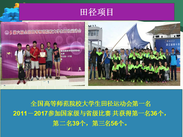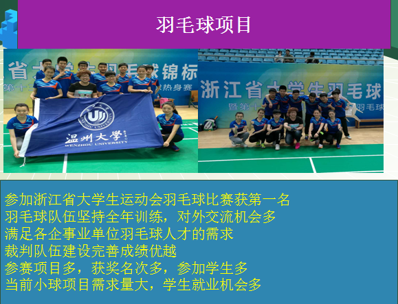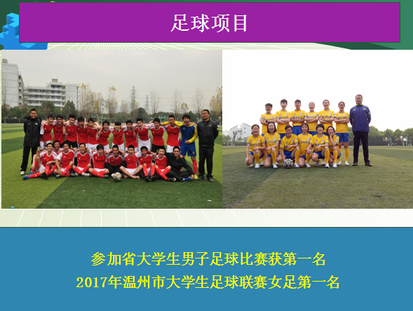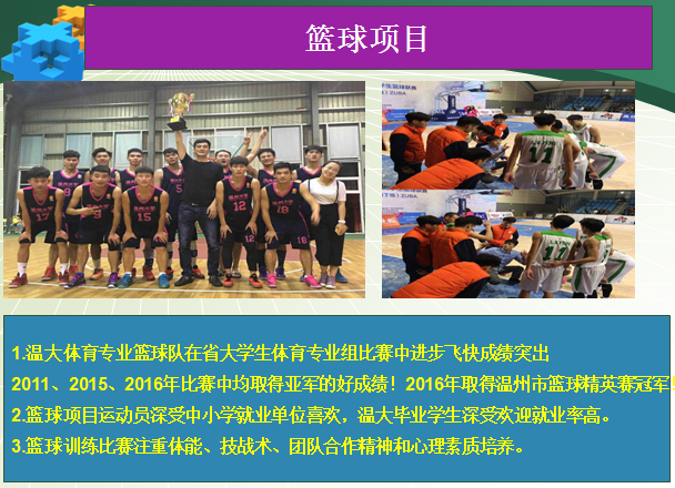 永利65335com永利65335com创建于1995年,是浙南地区团队力量最强的体育专业院系。永利65335com体育教育本科专业于2000年开始招生,2003-2008年评为省重点专业,2012-2016年评为校优势专业。本科员工人数总计320人。现设有体育教学训练部、体育科学部、大学体育部、体育场馆管理中心等四个学部,建有体育文化、体育教育与训练和体育社会科学等3个研究所,拥有运动人体科学实验中心、老员工体质测试中心、体育行业国家职业资格培训基地、国家体育总局体育文化研究基地和温州市健康体适能重点实验室。