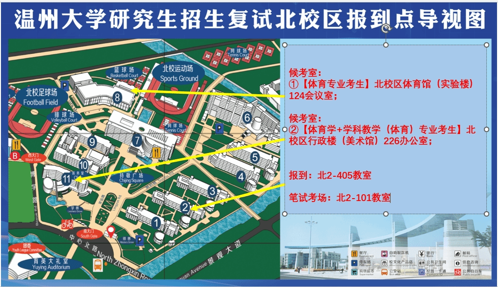 | 13:30-18:30 | 所有考生 候考时间另行通知 | 1.综合面试 2.外语测试 | 候考室: ①【体育学+学科教学(体育)专业考生】北校区行政楼(美术馆)226办公室; ②【体育专业考生】北校区体育馆(实验楼)124会议室; | 1. 考生提前到达候考室等待,审核准考证、身份证,按照要求上交电子产品等与面试无关的材料; 2. 告知具体面试室信息; 3. 提交有关复试材料原件,复试小组审核 |